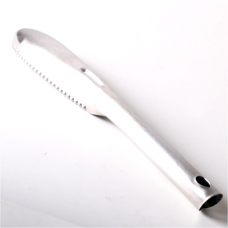 This fish scale remover is made of 304 stainless steel, sturdy, lightweight, anti-rust, non-toxic. Saw tooth design, evenly distributed saw tooth, it can remove the scale fast and conveniently. With this fish scale scraper, removes the scale safety without cutting hands, no hurt from scales. This scaling fish gadget with full stainless steel grip, quite strong and easily fit in hand. It also has hook ring at the end of the handle,it is easy to storage. Especially used by fish market or home for fish scale quickly scaling.Colors:Silver.Size:8.6"*1.4".